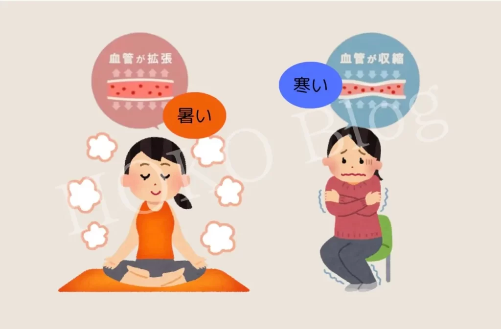 寒いとき → 体が熱を逃がさないように血管をぎゅっと縮める(血流が悪くなる)